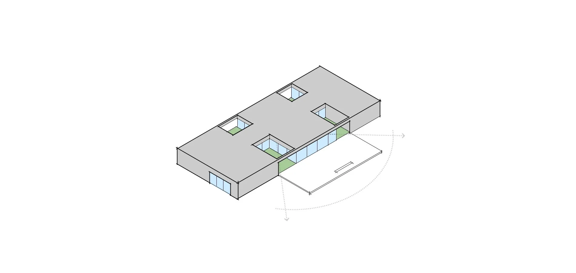 As a single storey structure, lateral extensions of spaces with large expanses of glass are more conducive to a pleasant visual experience than big vertical spaces.